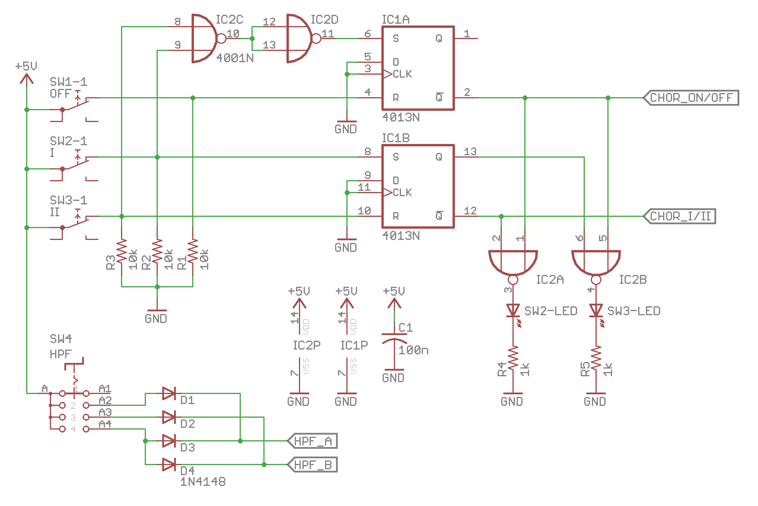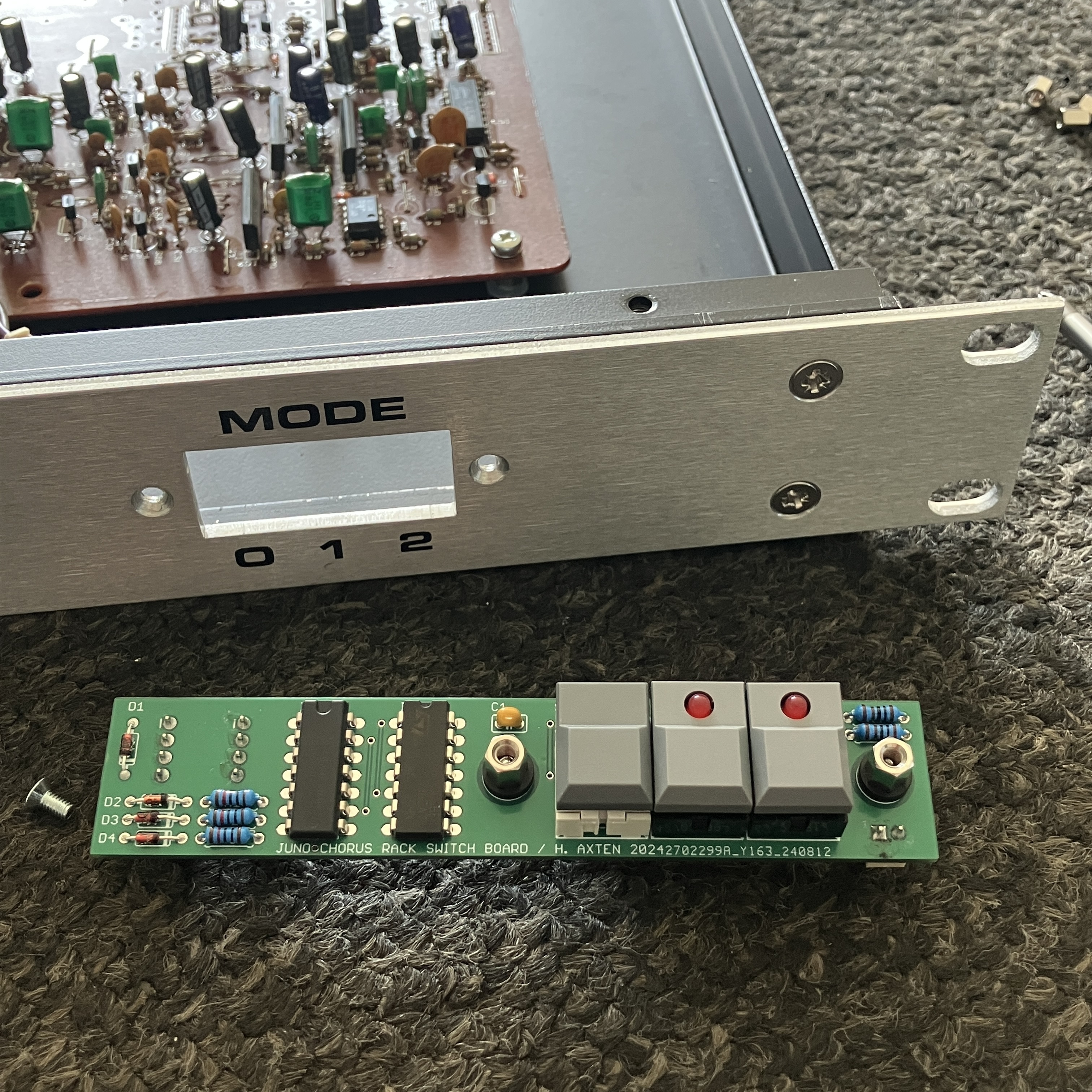 I could have simply used toggle switches for the various controls, which would have worked fine, but I wanted a final unit with a bit more pizazz, so I opted to recreate the three buttons that would have been on the 106’s front panel. The Juno of course did it with a microprocessor but for something this simple it made more sense to do it with plain logic - a 4013 dual flip-flop and a 4001 quad NOR gate. The HPF is controlled by a rotary switch with a few diodes to output the 2-bit binary selection. It’s housed in the aforementioned rack box, which was another eBay find - it had previously contained what appeared to be the power supply for somebody’s touring rig. I labelled the front panel with suitably vintage Letraset.