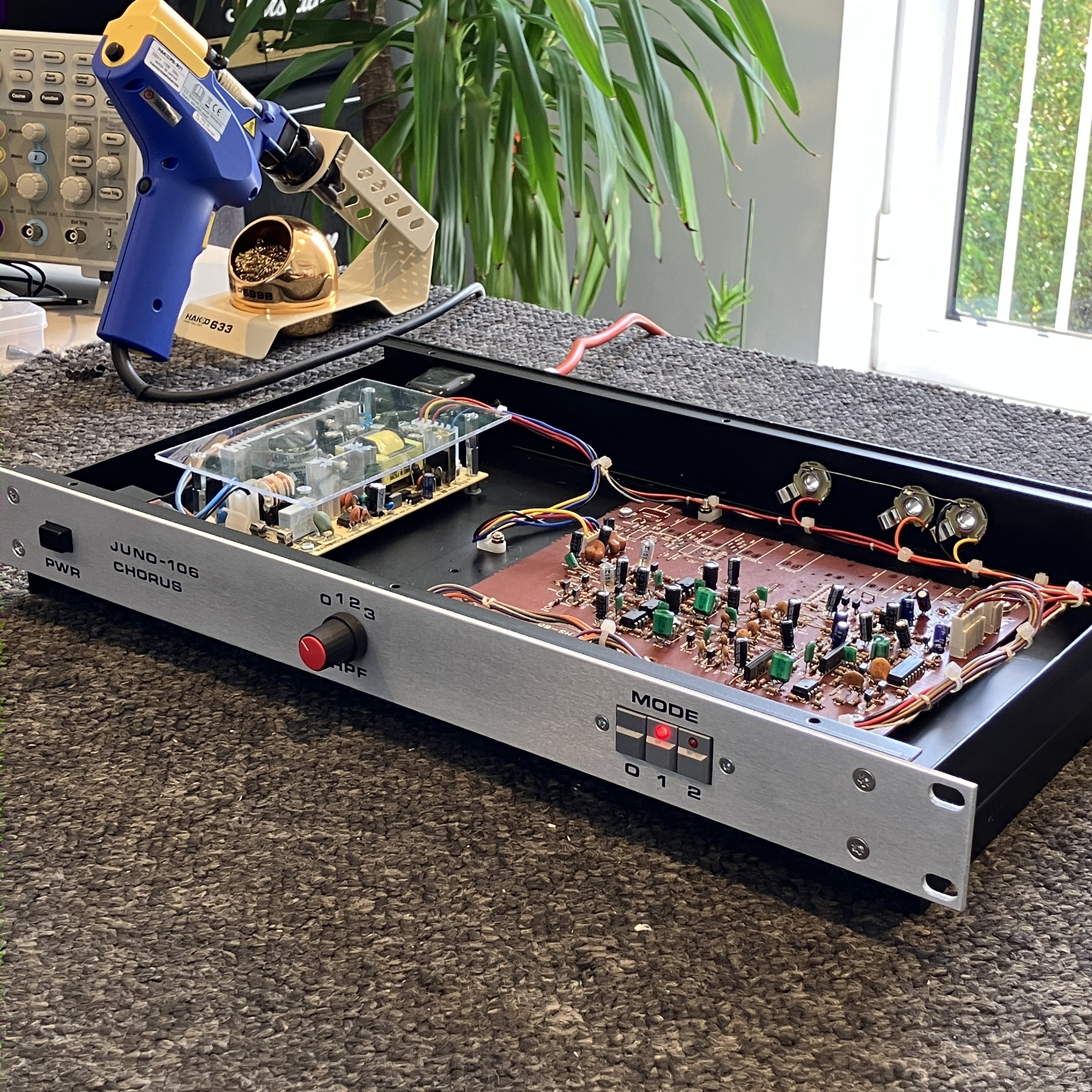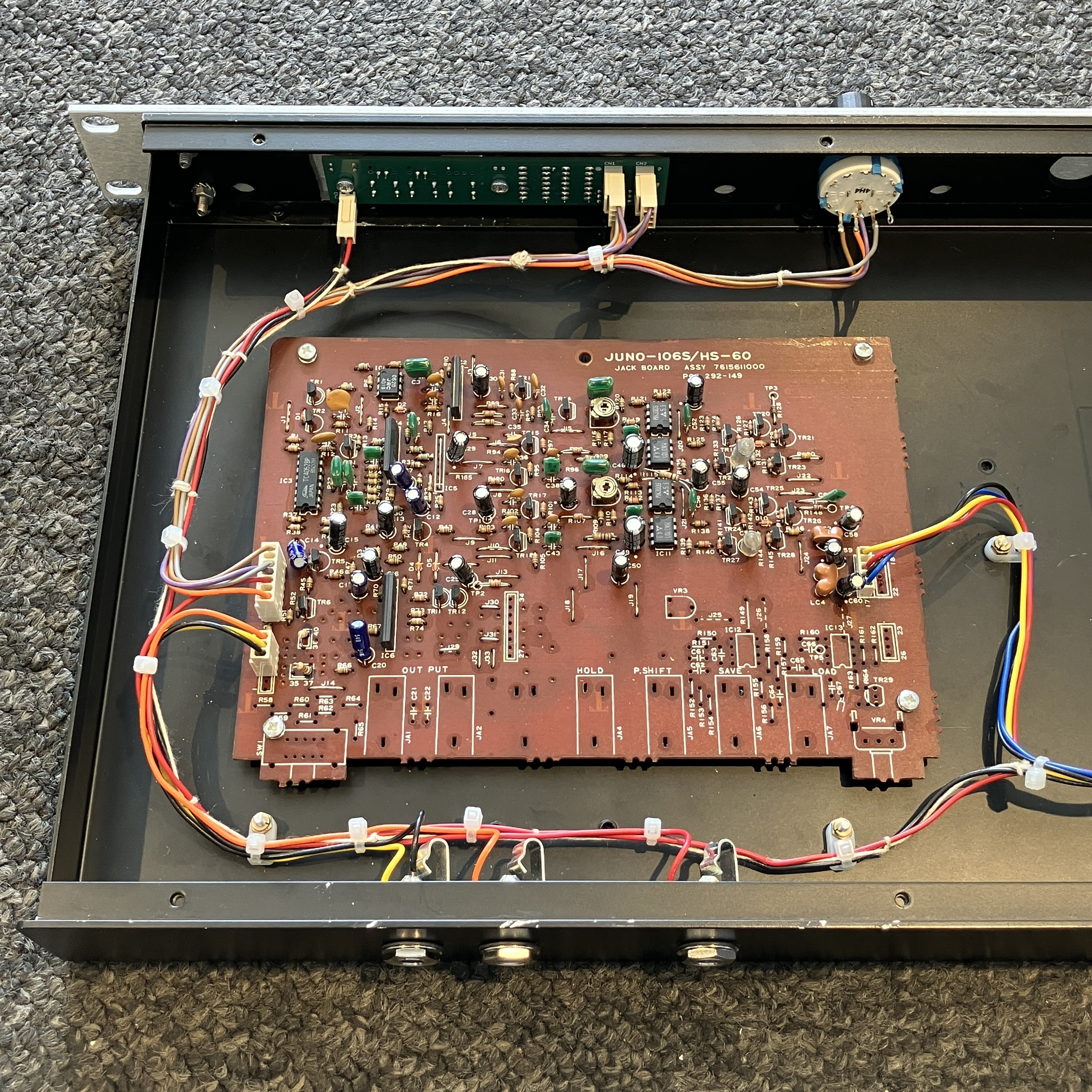 Last year while browsing eBay (the preamble to most of the things on this website) I found somebody parting out a Roland Juno-106 synthesizer. An increasingly rare occurrence now given their value, but the seller happened to have the chorus board for sale, which I bought for a nice price with a mind to building a standalone effect unit out of it. The Juno chorus needs little introduction - it’s one of the most well-liked and often-imitated stereo chorus effects ever devised - but in brief it’s two modulated BBD delays that produce a wonderful clean chorus effect with a convincing stereo image from a single mono input.