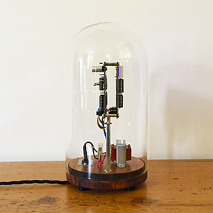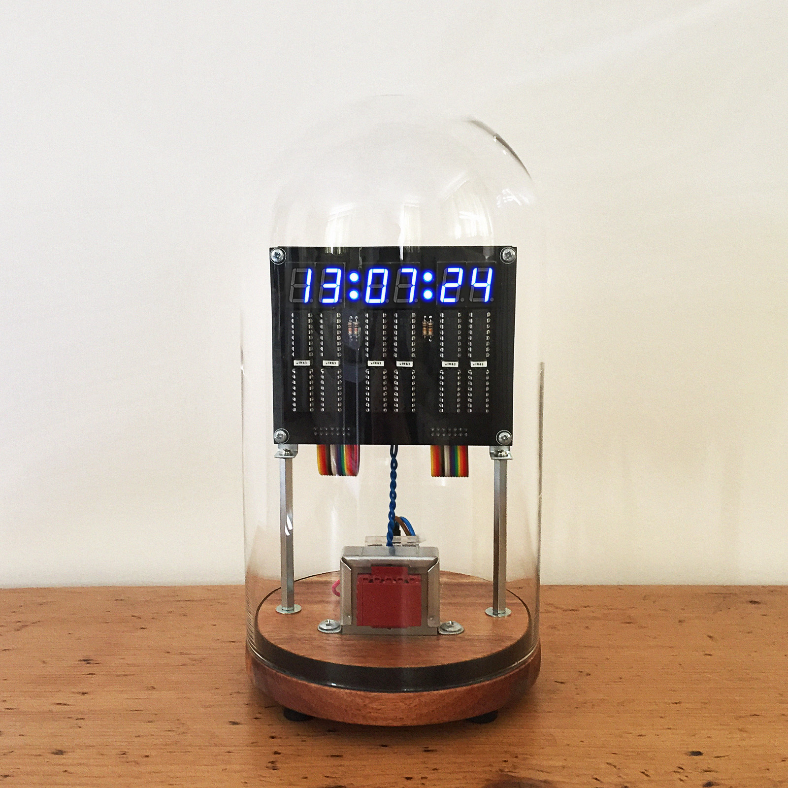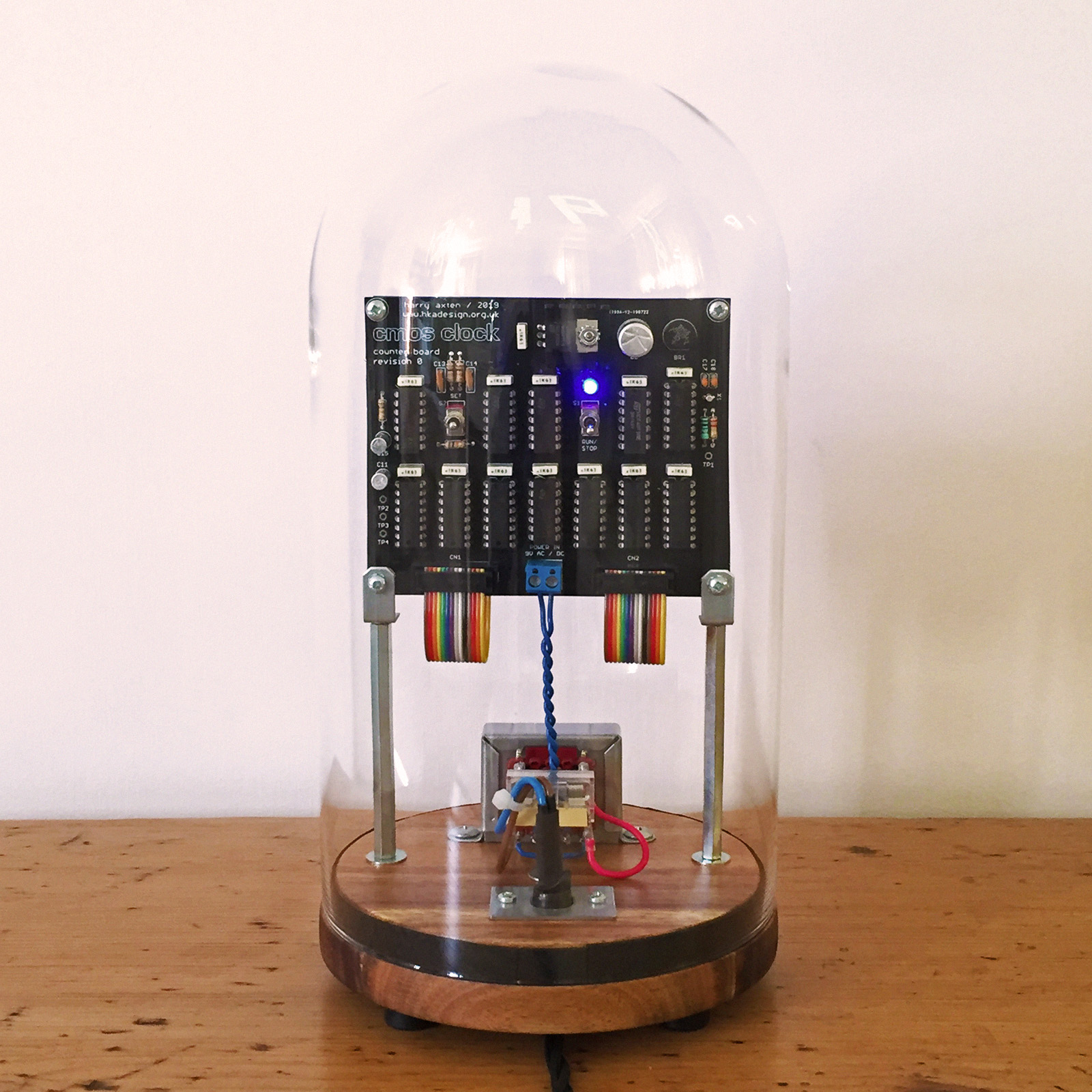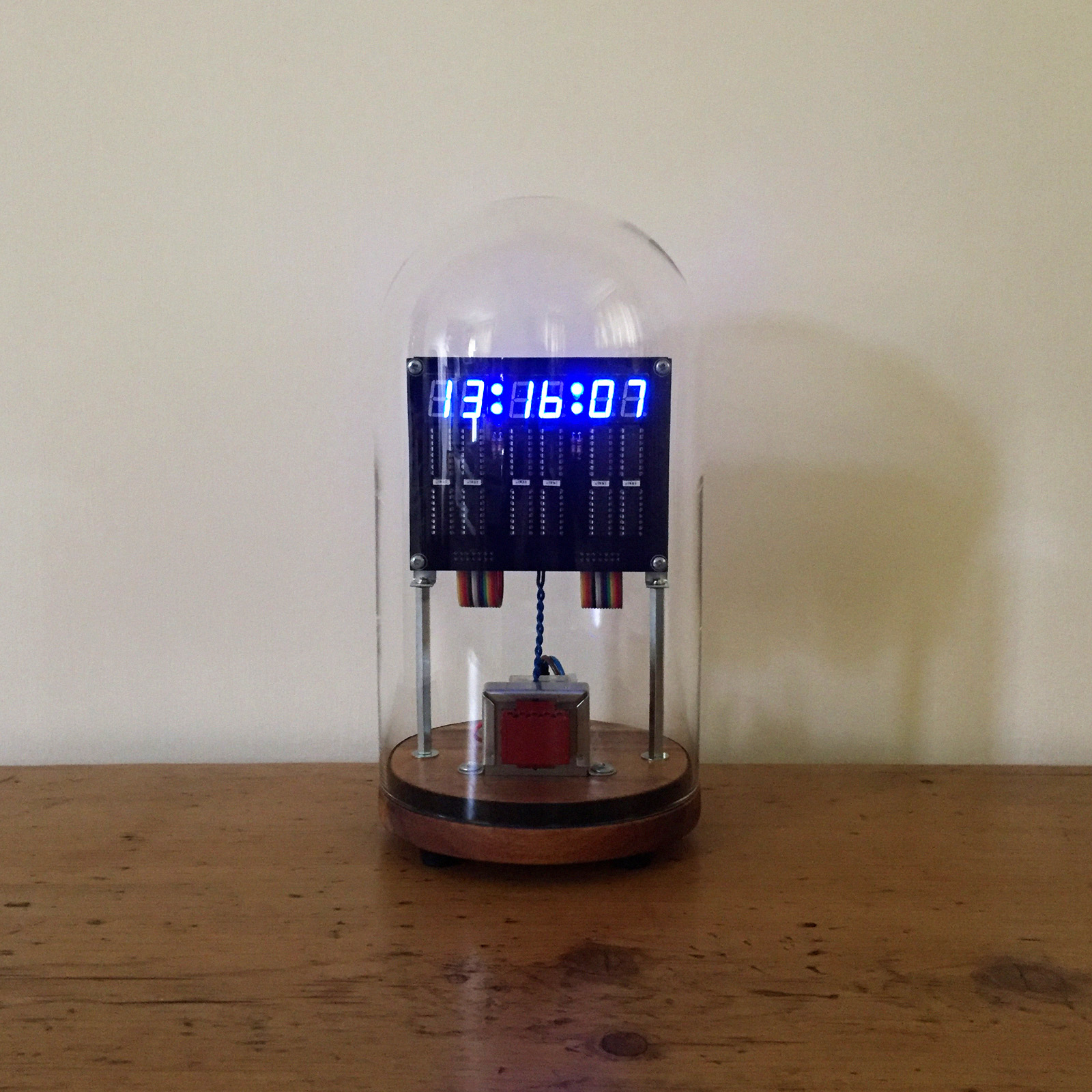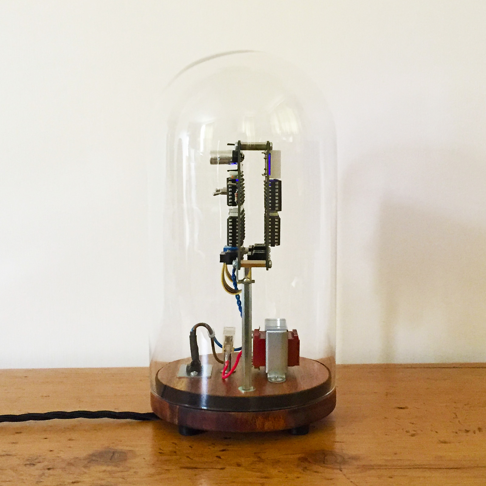 I wanted something a bit more interesting looking than a rather utilitarian project box, so I opted to house it all in a glass dome with a nice wooden base. The boards are sandwiched together using M3 hex spacers, with the whole assembly supported from the base using some 75mm M3 spacers and angle brackets. This leaves room underneath for the mains transformer, fuse and cable (which leaves through a grommet on a small metal plate).