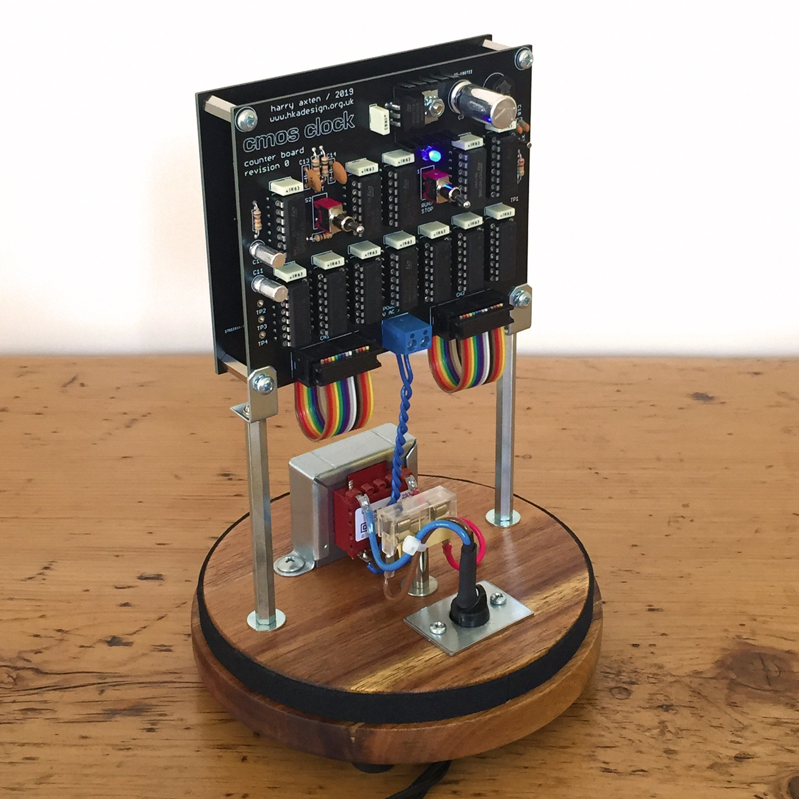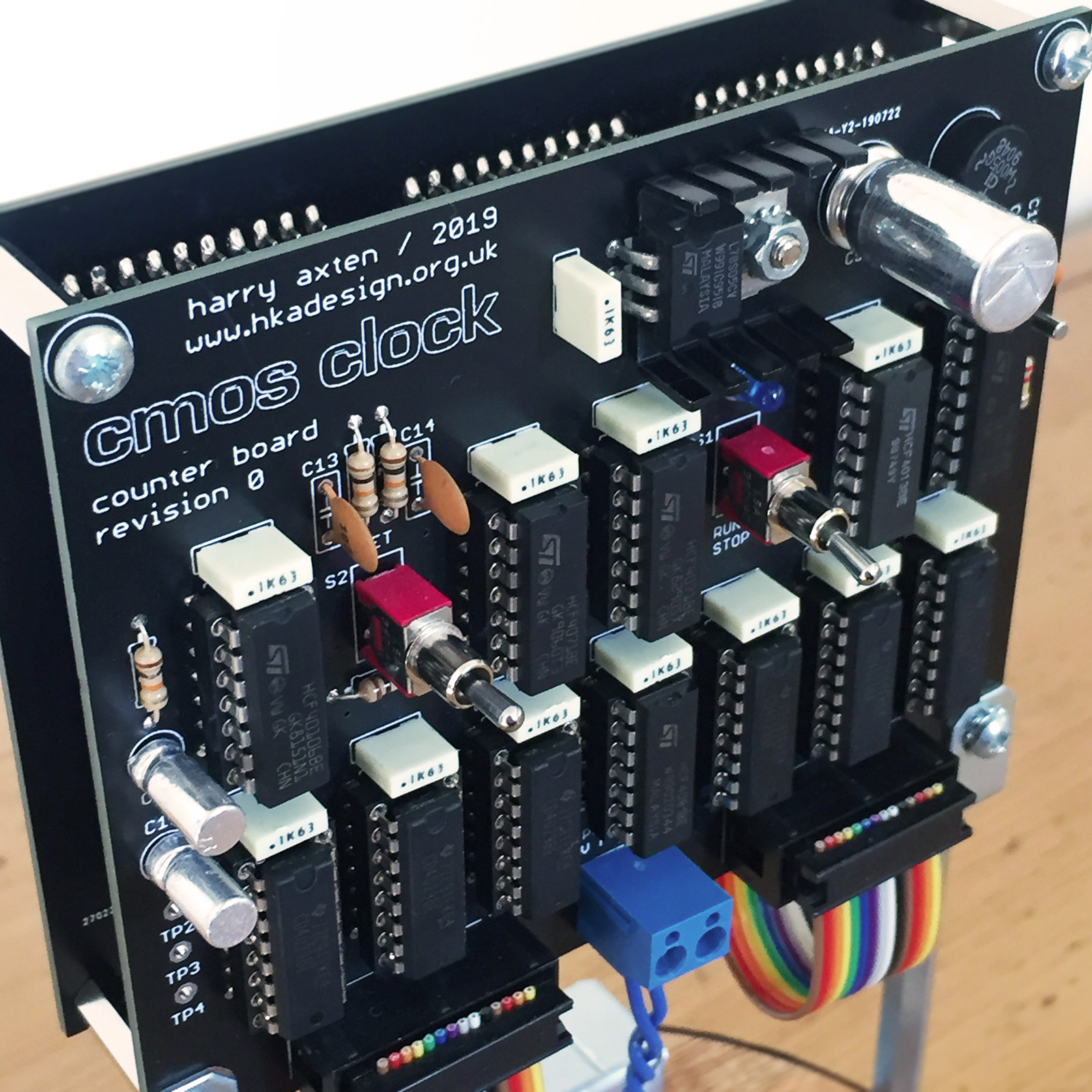 Apart from being a complete fingerprint magnet, I’m really pleased with how this one turned out. I really enjoyed the challenge of doing the whole thing with CMOS logic chips – not a line of code in sight! I’m already thinking about doing another with an alternative binary display board (which would be really easy as the counter board already outputs 4-bit BCD for each of the six digits). Beyond that, who knows – maybe a CMOS Calendar?