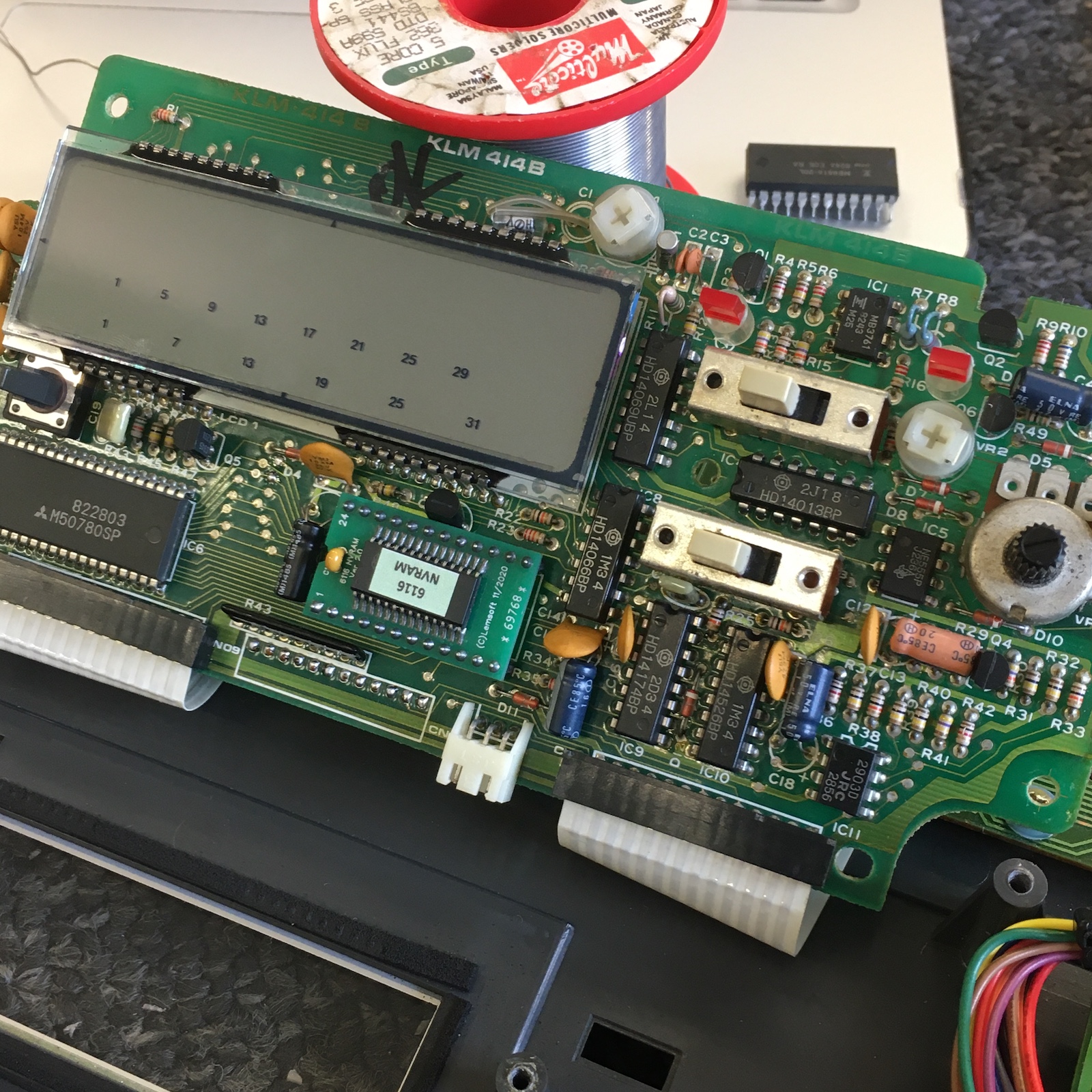 It is possible however to replace the original RAM IC on the CPU board (a standard 24-pin 6116-type 2kB SRAM) with a modern ‘F-RAM’ replacement module which will retain its contents almost indefinitely without any backup power needed at all! These modules are quite easy to come by as they’re popular with pinball machine enthusiasts, just do a search on eBay for ‘6116 NVRAM replacement module’. I paid about £15 for one at time of writing. You will need quality de-soldering gear to remove the original RAM IC without damaging the board though (I use a Hakko FR-301). Note that there’s not enough vertical height to fit it in a socket.